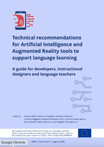 Fridolin Wild, Mikhail Fominykh, Andreas Kißmehl, Tormod Aagaard, Antigoni Parmaxi, Eirini Christou, Anke Berns, Lina Adinolfi, Skevi Vassiliou, and Angeliki Voreopoulou (2025) Technical recommendations for Artificial Intelligence and Augmented Reality tools to support language learning: A guide for developers, instructional designers and language teachers. ARIDLL Consortium. https://aridll.eu/